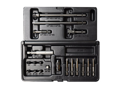 ①驅動頭 1/4” 六角頭。 ②電動工具最佳附屬配件。 ③尺寸齊全,多途廣泛。 ④裝置於塑膠收納盒內。